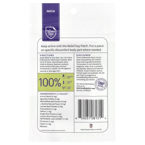 Нужен комфорт? Нашивки в честь Дня помощи. Эти дневные патчи на растительной основе помогут вам. Содержит экстракт арники и кору белой ивы для использования в течение дня.
