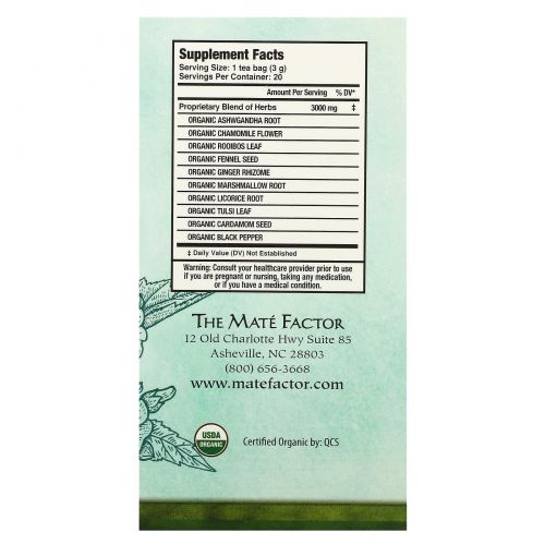Описание товара Mate Factor, Stress SOS с зефиром и ашвагандой, без кофеина, 20 чайных пакетиков, 60 г (2,12 унции)
