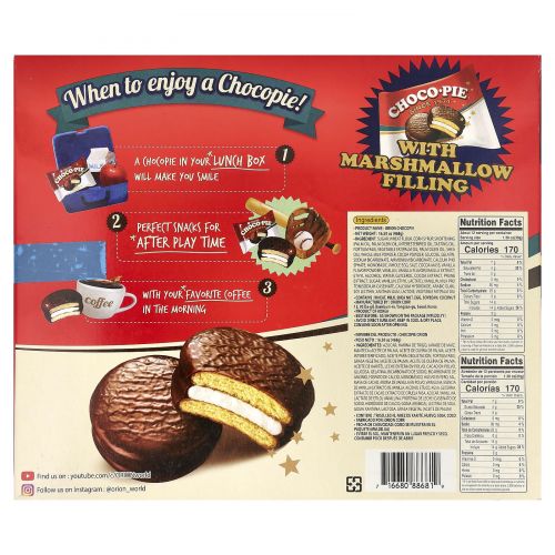 Orion Choco-Pie - это нежное печенье, покрытое шоколадной прослойкой с уникальной пастилой, которое выпекается по оригинальной рецептуре с 1974 года. Благодаря удобной индивидуальной упаковке Orion Choco-Pie подходит на все случаи жизни: дома с чаем, в школе на перемене, в университете, на работе, в качестве угощения для любого торжества. Запатентованная технология производства и индивидуальная упаковка позволяют Orion Choco-Pie долгое время оставаться мягким и свежим.