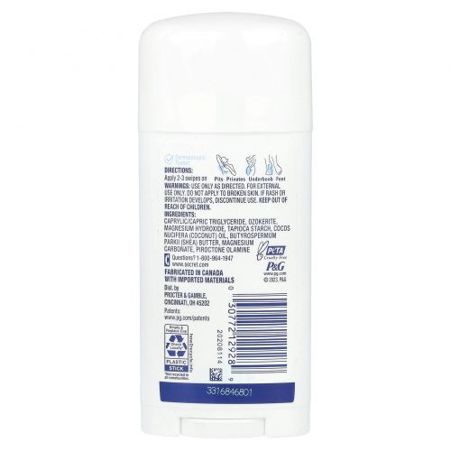 Описание товара Secret, Дезодорант для всего тела, сухое вещество без алюминия, без запаха, 68 г (2,4 унции)