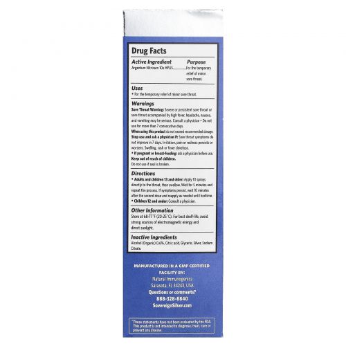 Описание товара Sovereign Silver, Спрей от боли в горле от нескольких симптомов, 59 мл (2 жидк. унц.)