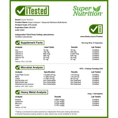 Мультивитамины для хорошего самочувствия при смене сезонов* Super Immune+ от Super Nutrition® специально разработаны для поддержки здоровья иммунной системы*. Получить все необходимые питательные вещества только из рациона может быть сложно, но высококачественные мультивитамины помогают восполнить эти пробелы. Данный продукт содержит необходимые витамины и минералы, а также комплексы Super Adaptogen (адаптогены), BlueGreen (сине-зелёные растительные ингредиенты), Antioxidant (антиоксиданты) и Spice (специи). Он помогает обеспечить поддержку, необходимую для здоровья иммунной системы*.
