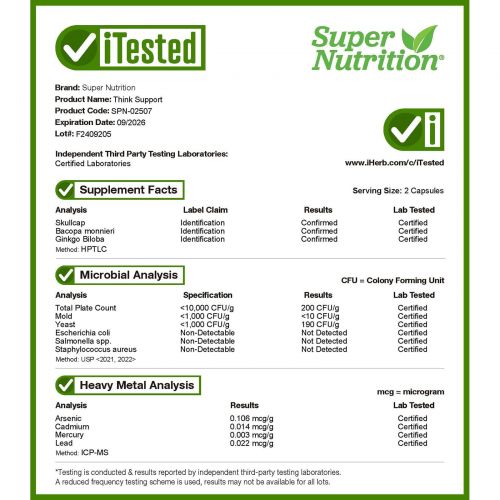 Super Nutrition, Think Support, с гинкго билоба, тюбетейкой, готу колой, бакопой и ферментами, 180 растительных капсул