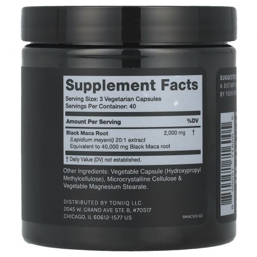Капсулы Toniiq Black Maca содержат 2000 мг порошка корня черной маки высочайшего качества в каждой таблетке, выращенной и выращенной в Перу с использованием процесса экстракции, чтобы обеспечить соотношение экстракта 20: 1 (или эквивалент 40 000 мг необработанного порошка черной маки).