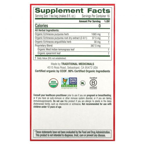 Описание товара Traditional Medicinals, Сезонный чай, органическая эхинацея плюс, без кофеина, 16 индивидуально упакованных чайных пакетиков, 0,85 унции (24 г)