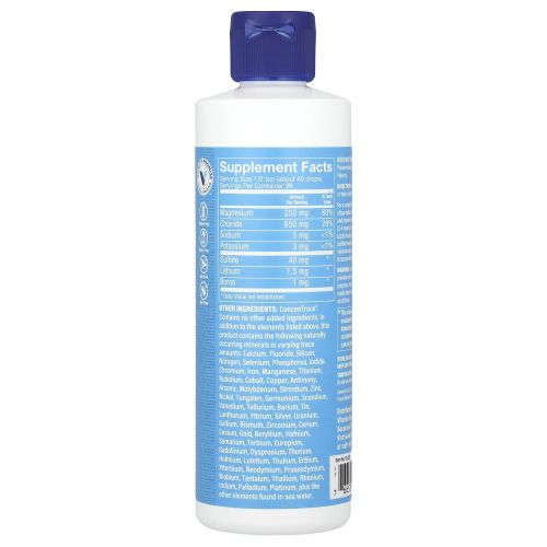 Не содержит других добавленных ингредиентов. В дополнение к перечисленным выше элементам, этот продукт содержит следующие встречающиеся в природе минералы в различных следовых количествах: кальций, фторид, кремний, азот, селена, фосфор, лодид, хром, железа, марганец, титан, рубидий, кобальт, медь, сурьма, мышьяк, молибден, стронций, цинк, никель, вольфрам, германий, скандий, ванадий, теллур, барий, жесть, лантан, иттрий, серебро, уран, галлий, висмут, цирконий, церий, цезий, золото, бериллий, гафний, самарий, тербий, европий, гадолиний, диспрозий, торий, гольмий, лютеций, тулий, эрбий, иттербий, неодим, празеодим, ниобий, тантал, таллий, рений, индий, палладий, платина, плюс другие элементы, содержащиеся в морской воде.